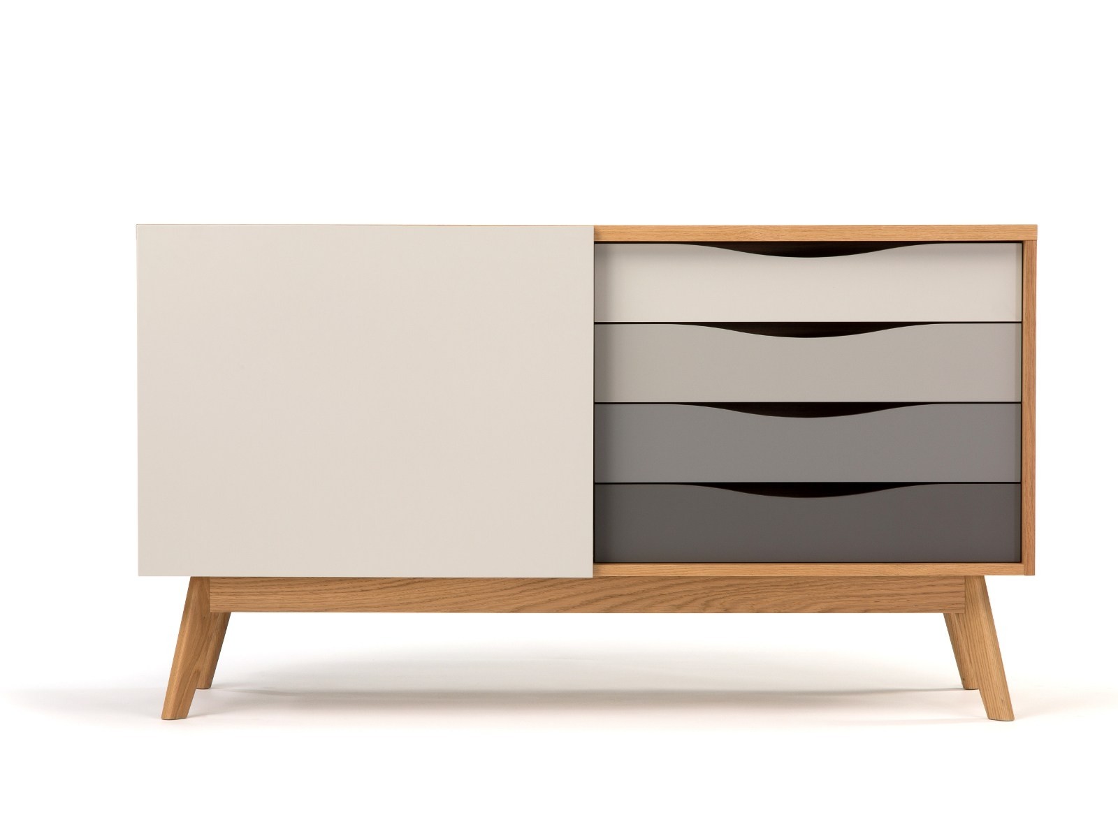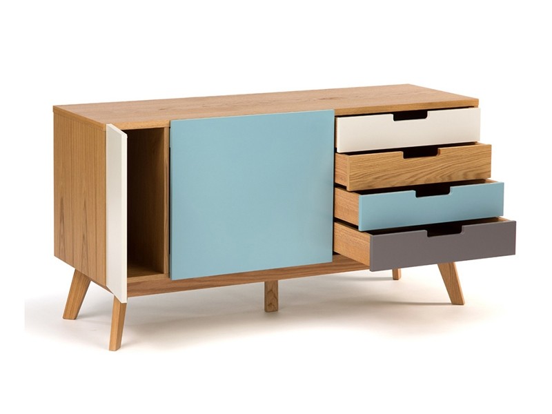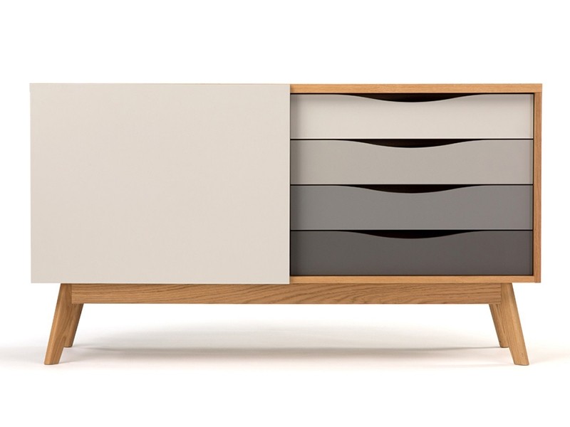 Tủ TV05 được cấu tạo 4 hộc kéo giúp gia chủ có thể tận dụng được tối đa không gian để vật dụng và thêm một cánh cửa lùa được chia ngăn tầng bên trong bạn có thể thoải mái trưng bày những vật dụng yêu thích.
